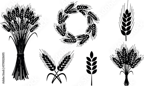 Fototapeta premium Wheat ears bundle and wreath simple black silhouette vector design elements...