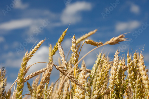© larineb, Fototapeta premium wheat ears closeup on blue sky background