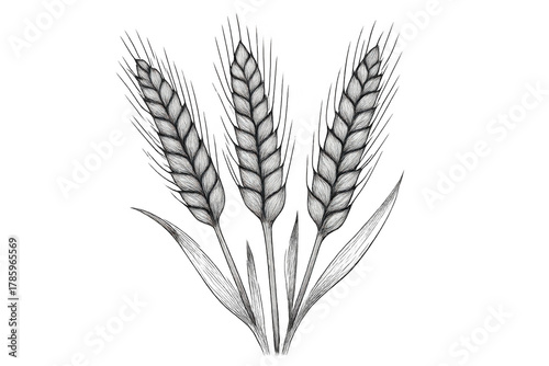 Obraz premium Wheat ears drawing in black and white, depicting ripe cereal crop for agriculture, food, and harvest themes. Transparent background