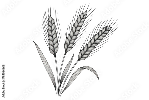 Fototapeta premium Wheat ears drawing with grain stalk plants, representing agriculture, food, and harvest concepts in black and white sketch