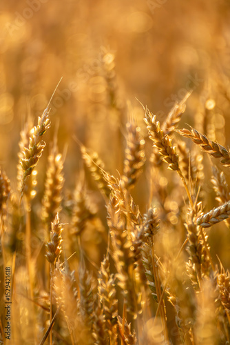 Fototapeta premium Wheat ears in golden morning light, vertical image with ripe field
