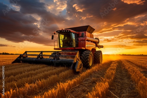 Fototapeta premium Wheat Field At Sunset With A Combine Harvester, Generative AI