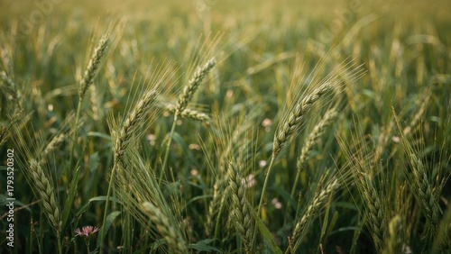 © Lasvu, Obraz premium Wheat field at sunset with green stalks and mature heads, lush and ripe for harvest. Agricultural landscape, crops, farming. The concept of agriculture and harvest.