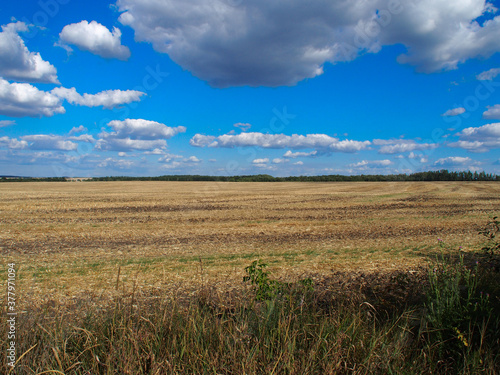 © Roman, Fototapeta premium Wheat field, blue sky, clouds, green forest. Copy space for text.