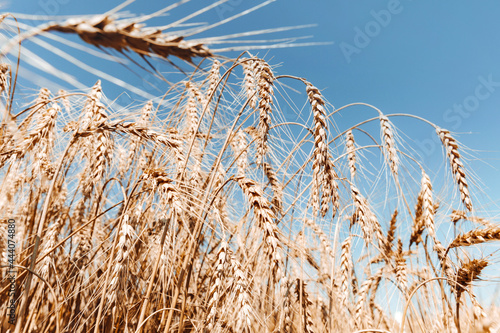 Fototapeta premium Wheat field. Golden ears of corn against the blue sky.
