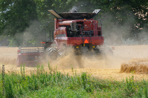 © Carrie, Fototapeta premium Wheat field harvested by a red combine.