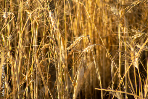 Fototapeta premium Wheat field in summer with dry and underdeveloped ears due to drought....