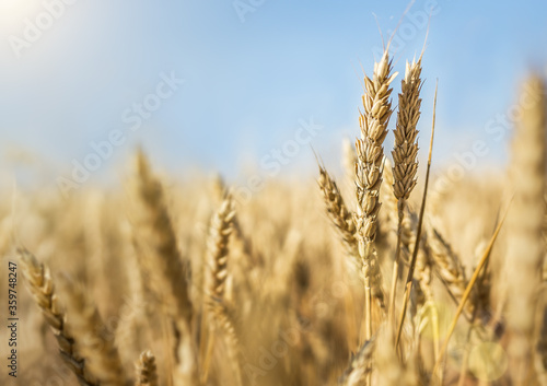 Fototapeta premium Wheat field with blue sky and sunlight