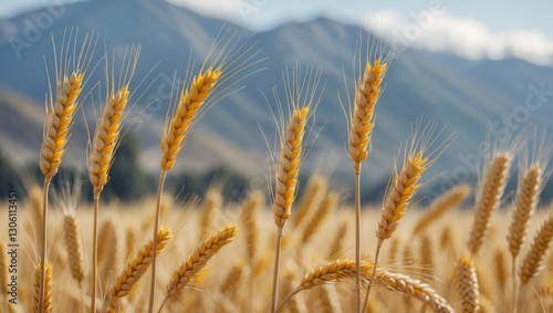 © Giovanni, Fototapeta premium Wheat Fields Swaying in the Breeze with Majestic Mountains in the Background Under a Clear Blue Sky