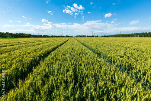 Fototapeta premium Wheat is growing in the field ,The wheat fields are under the blue sky and white clouds