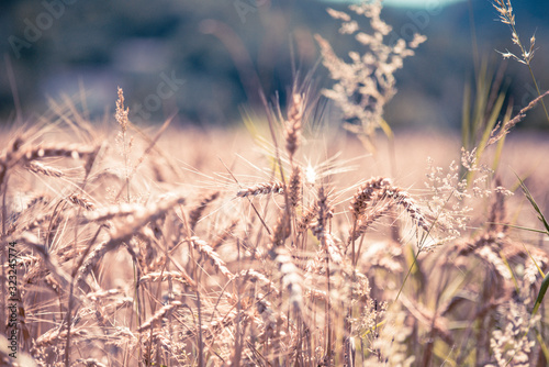 © dieter, Fototapeta premium Wheat or grain field. Beautiful Nature Landscape. Rural Scenery under Shining Sunlight. Background of ripening ears of wheat field nad trees.