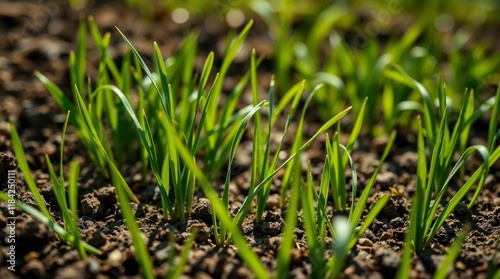 Fototapeta premium Wheat Sprouts Emerging from Soil, Depicting the Germination Process