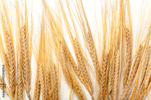 © fotofabrika, Fototapeta premium Wheat stalks arranged in a pattern on a light background during the daytime