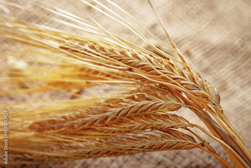 © fotofabrika, Naklejka premium Wheat stalks displayed on rough fabric in a bright sunlight setting during the harvest season