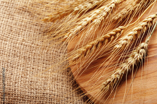 Obraz premium Wheat stalks laid on a wooden board with burlap fabric as background