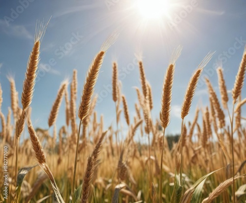 © Sayfar, Fototapeta premium Wheat stalks stand tall and proud in the sunlight on a sunny summer day, golden wheat fields,