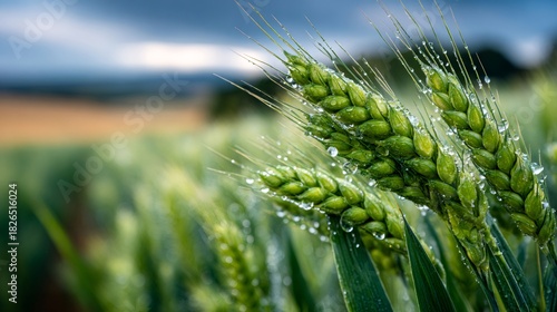 © Lubos Chlubny, Naklejka premium Wheatfield with green wheat spikes after rain