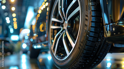 Fototapeta premium Wheel of a luxury modern car in a car showroom