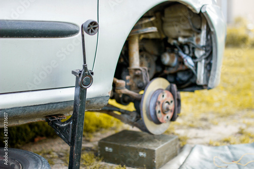 © velimir, Fototapeta premium wheel replacement, the machine is lifted on a jack. breakdown on the road.