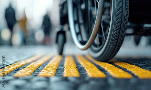 © NovaVision, Naklejka premium Wheelchair navigating tactile paving, symbolizing urban accessibility and inclusivity for all citizens.
