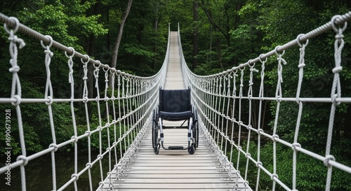 Obraz premium Wheelchair on suspended rope bridge in forest with lush greenery