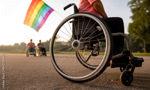 © Nuri_Studio, Obraz premium Wheelchair user holding rainbow flag in park, two more blurry in background