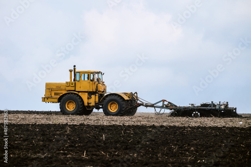 © nskyr2, Obraz premium Wheeled tractor pulls the disc harrow