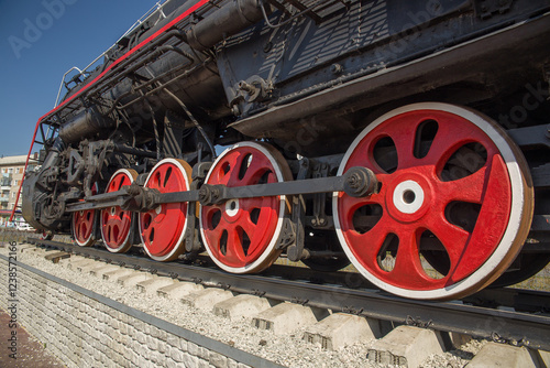 Naklejka premium Wheels of an old locomotive. Chassis of a steam locomotive.
