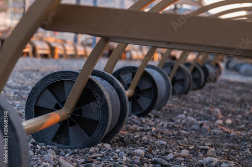 © Vladimir, Fototapeta premium Wheels of empty, folded deck chairs. Close-up. Early morning, Turkey.