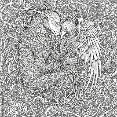 Naklejka premium Where darkness dances with wonder. Explore a world of strange beasts and hidden magic in this captivating coloring book page.