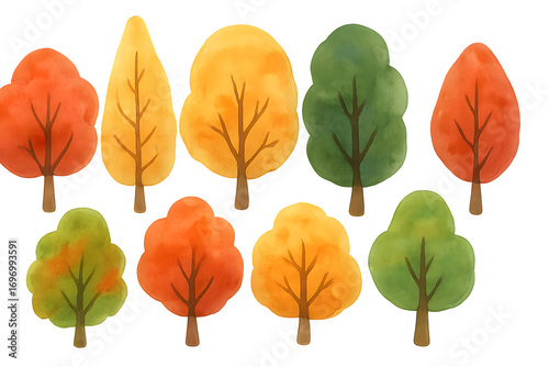 © Icon_Zone, Obraz premium Whimsical autumn forest cartoon illustration with red, green, and orange trees perfect for decorative seasonal and creative artwork