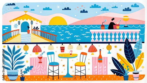Obraz premium Whimsical beachside cafe illustration with person enjoying scenic ocean view