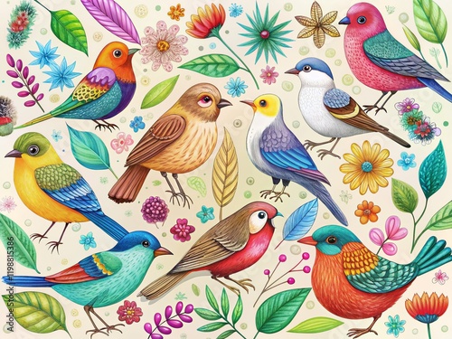 Fototapeta premium Whimsical Bird Doodles Arranged According to the Rule of Thirds - Cute...