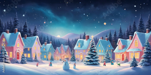 Naklejka premium Whimsical cartoon Christmas Village Starry Night Room for Copy