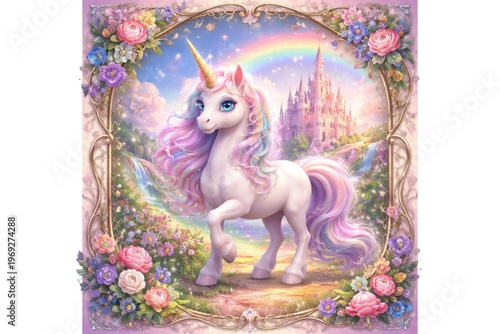 Obraz premium Whimsical cartoon unicorn with magical fairy tale castle frame