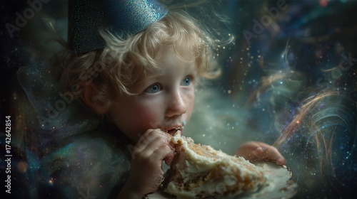 © Niroa, Fototapeta premium Whimsical Child Eating Cake at Magical Birthday