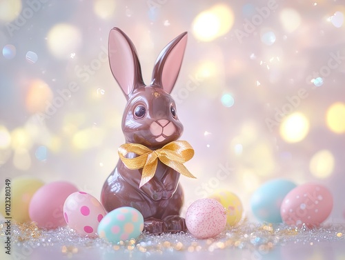 © Alex, Obraz premium Whimsical Chocolate Bunny Figurine with Golden Ribbon: Perfect Poster for Easter Decor, Featuring Pastel Eggs and Sparkling Bokeh for a Playful Touch in Any Space!