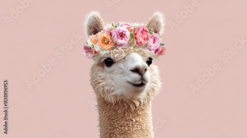 © Julia, Naklejka premium Whimsical close-up portrait of alpaca with floral crown on soft pink background