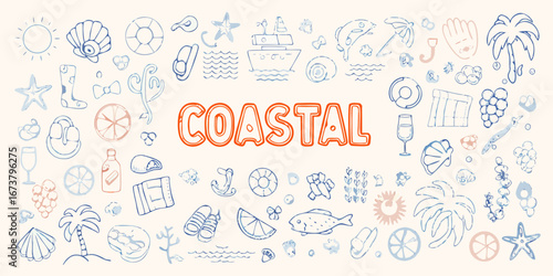 Fototapeta premium Whimsical coastal doodle collection featuring the word coastal and beach...