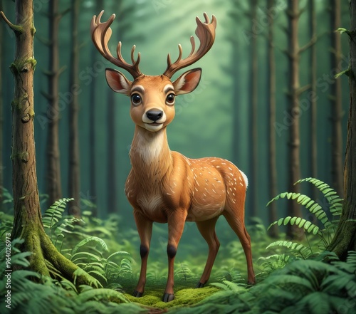 Fototapeta premium Whimsical deer standing gracefully in a lush green forest, with sunlight...