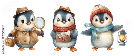 © vectorizer88, Fototapeta premium Whimsical Detective Penguins in Noir Style Watercolor Illustration
