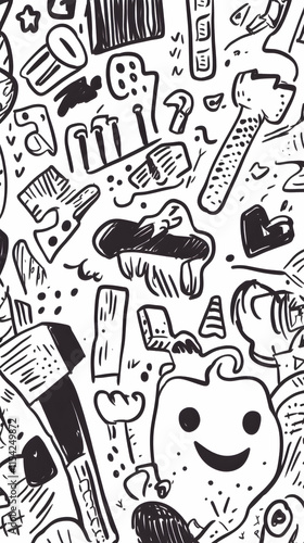 Obraz premium Whimsical doodle art background; city objects, tools, and smileys; white...