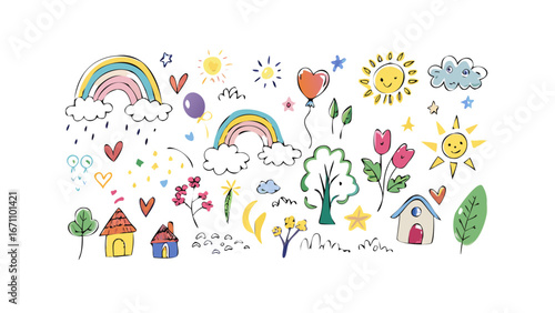 Fototapeta premium Whimsical doodle elements with nature and weather rainbow