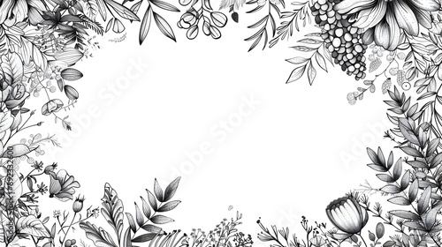 © Chanakan, Fototapeta premium Whimsical Doodle Page Border Design with Botanical Patterns and Blank Space for MockUp Message