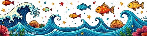 © Ampere, Naklejka premium Whimsical doodle pattern with waves, shells, and fish, whimsical, abstract, artistic