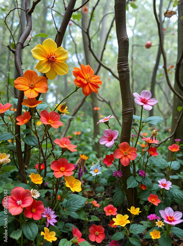 Obraz premium Whimsical Fairy Forest with Bright Colors: Enchanted Vines, Flowers, and Magic Nature
