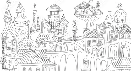 © marjan, Fototapeta premium Whimsical Fantasy Cityscape Coloring Page with Unique Architectural Dwellings