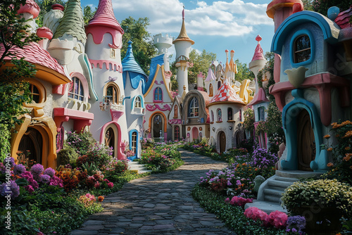 © JEMEE, Fototapeta premium Whimsical fantasy village with colorful fairytale houses and cobblestone path