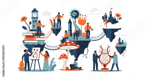 Naklejka premium Whimsical Floating Islands Depicting Art, Music, and Knowledge