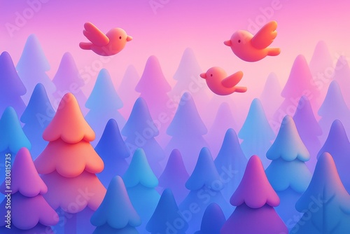 © Who is Danny, Naklejka premium Whimsical forest of pastel-colored trees with three stylized birds flying in soft light against a dreamy gradient background at sunrise. Ai generative